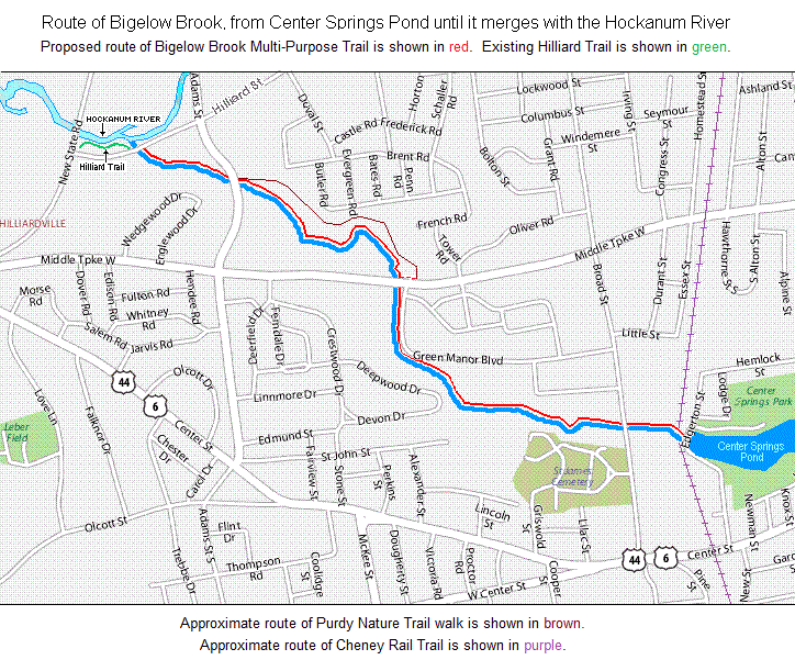 As proposed, this trail would parallel Bigelow Brook from its source in Center Springs Park until it merges with the
