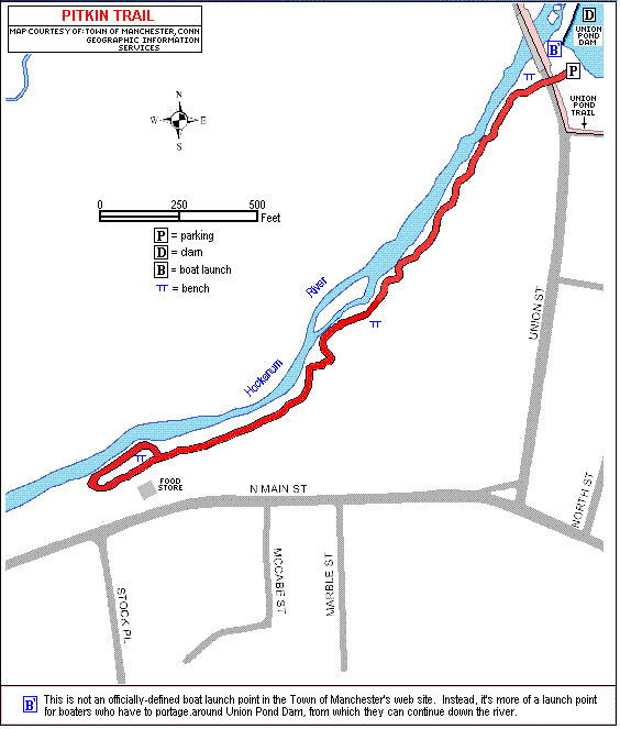 The Pitkin Trail is located downstream from Union Street and the Union Pond Dam. Parking is located on the east side